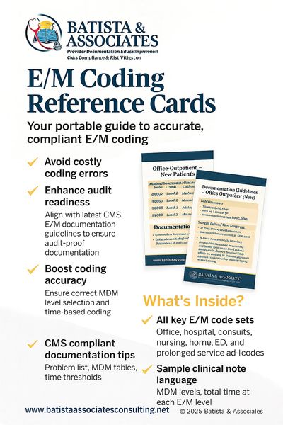 “The Batista & Associates E/M Reference Card Set is more than a coding aid — it’s a compliance safeguard and educational resource physicians can trust every day.”